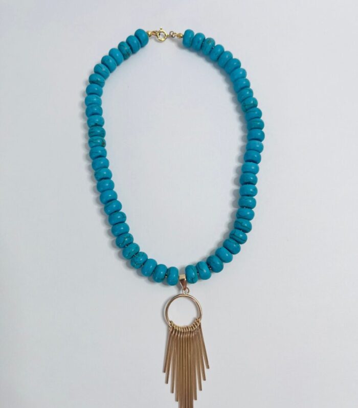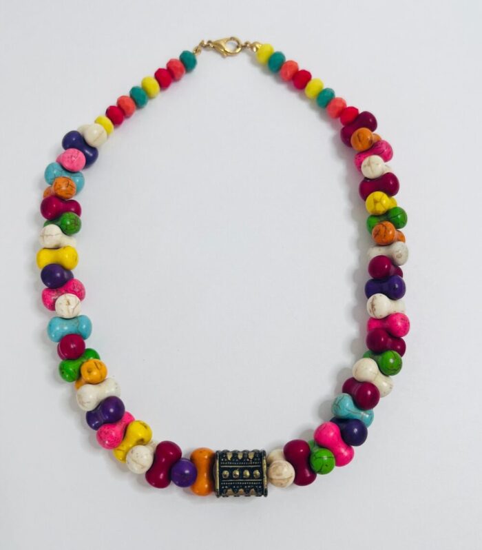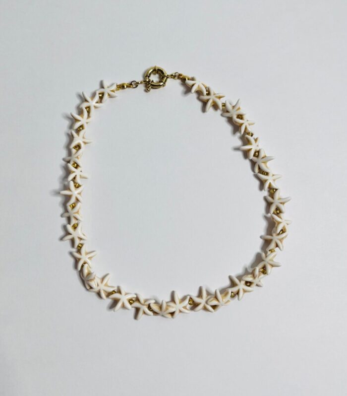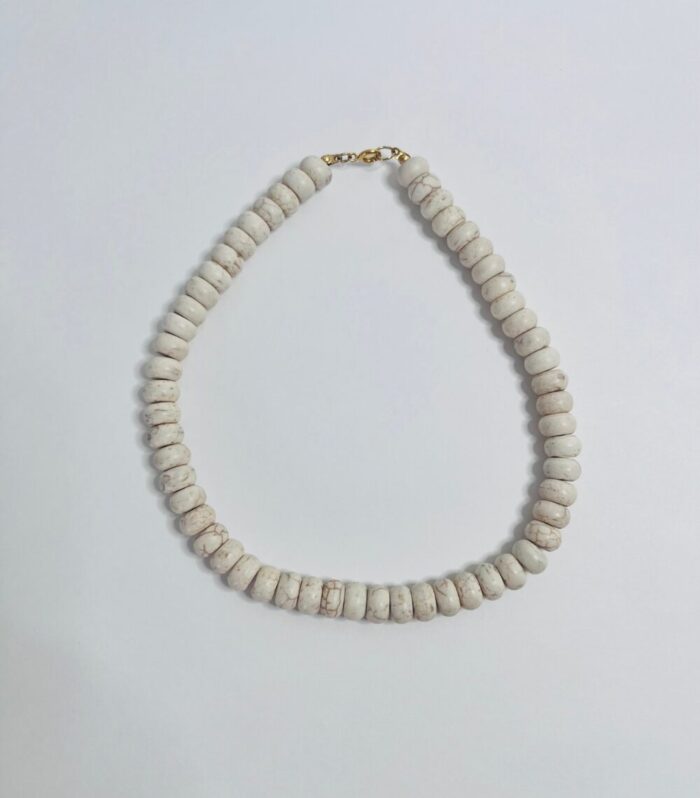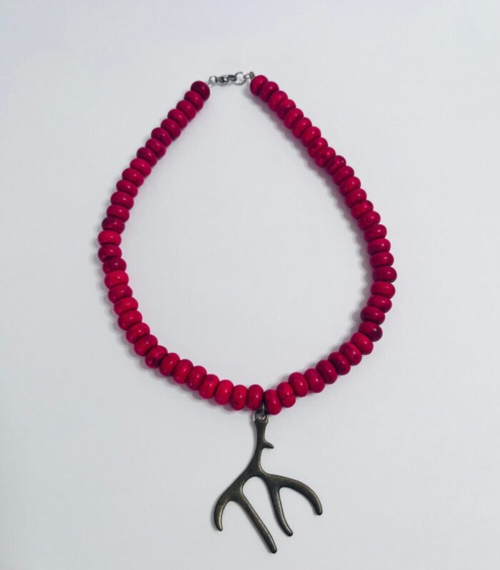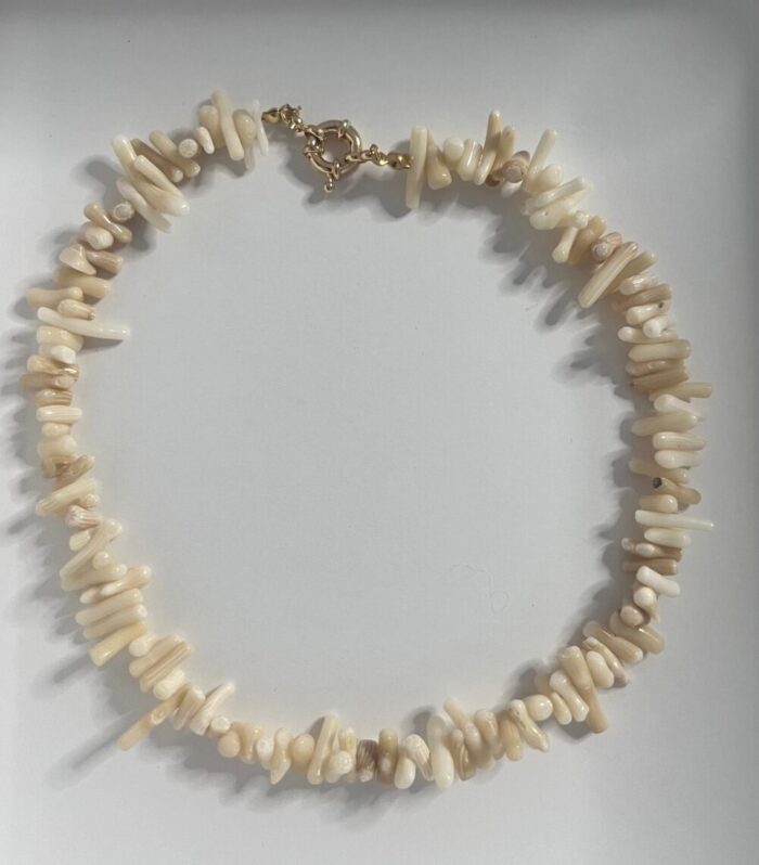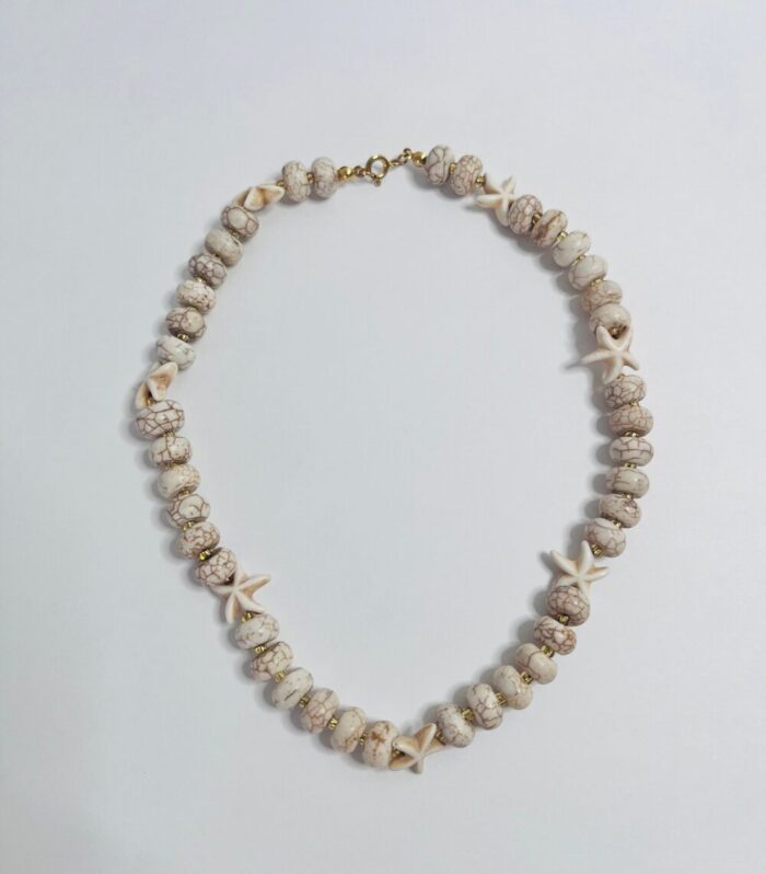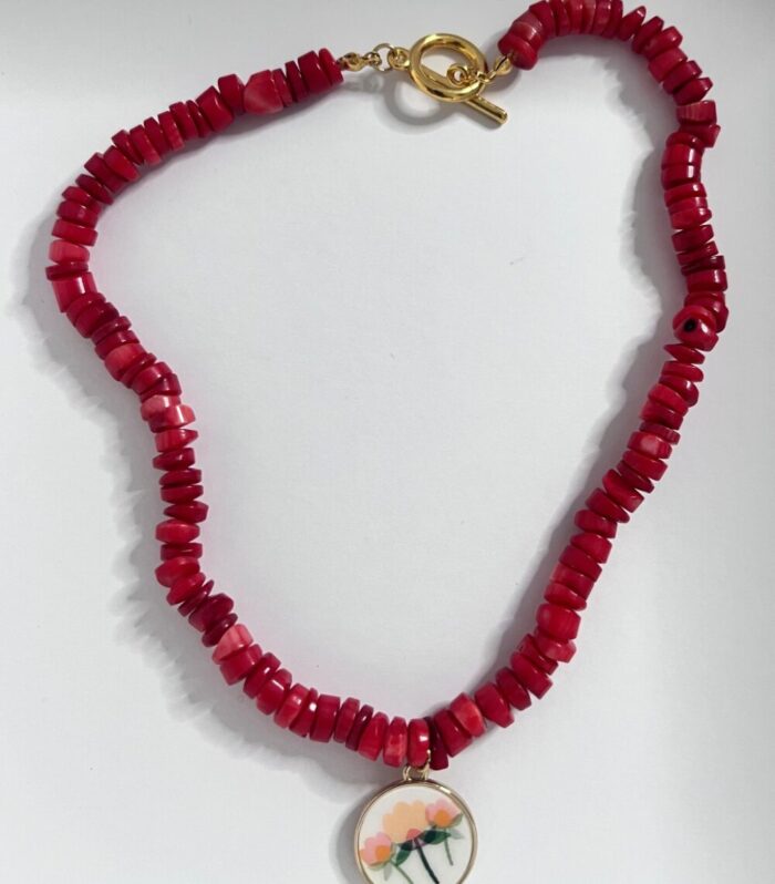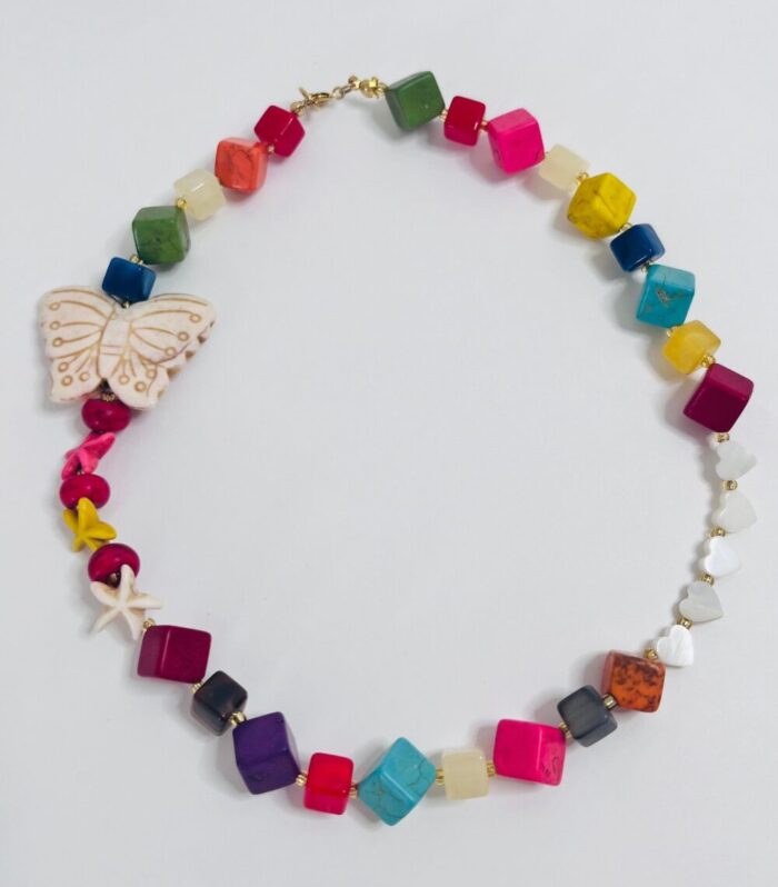 Handmade necklace with fossil stone, butterfly and heart in mother-of-pearl